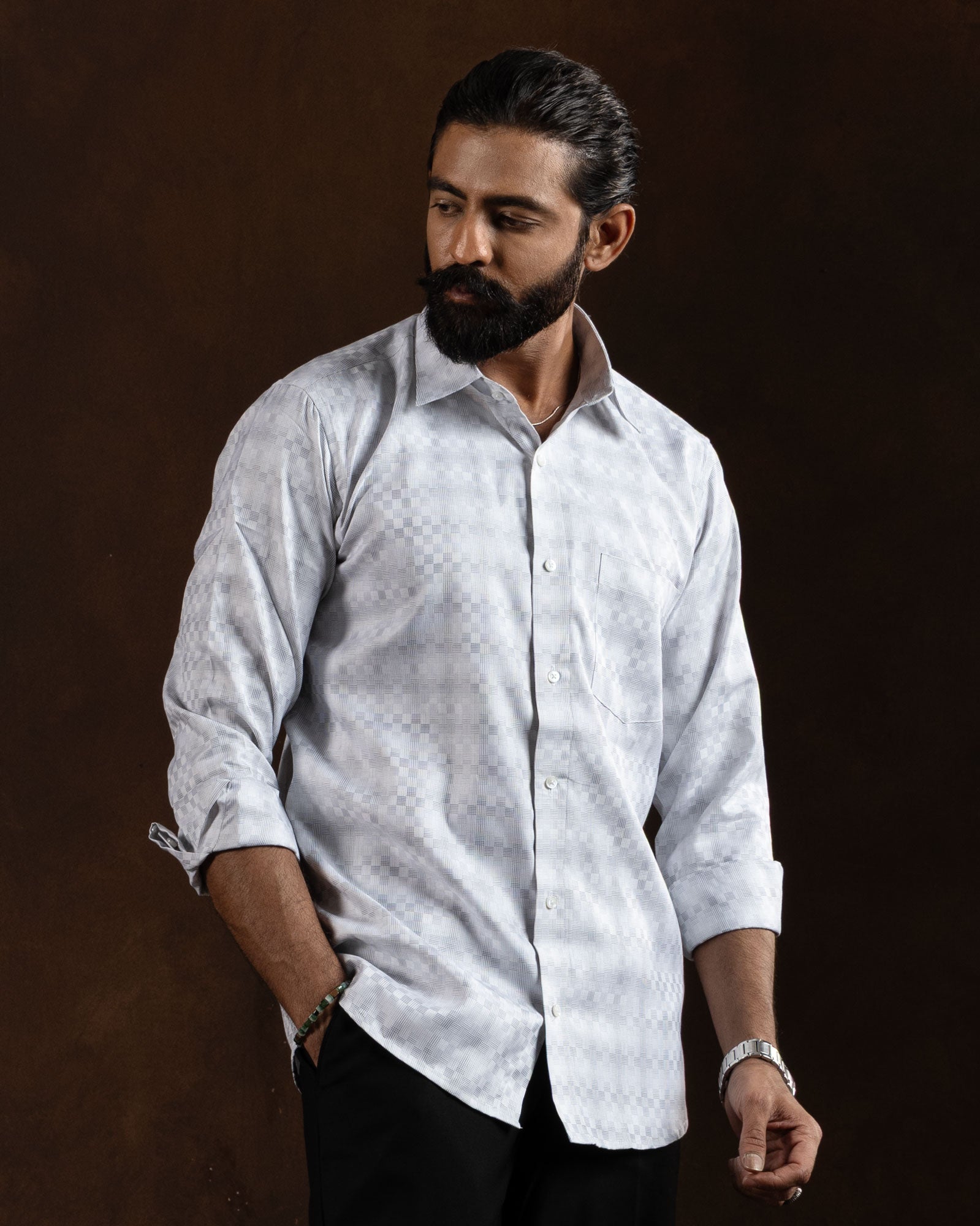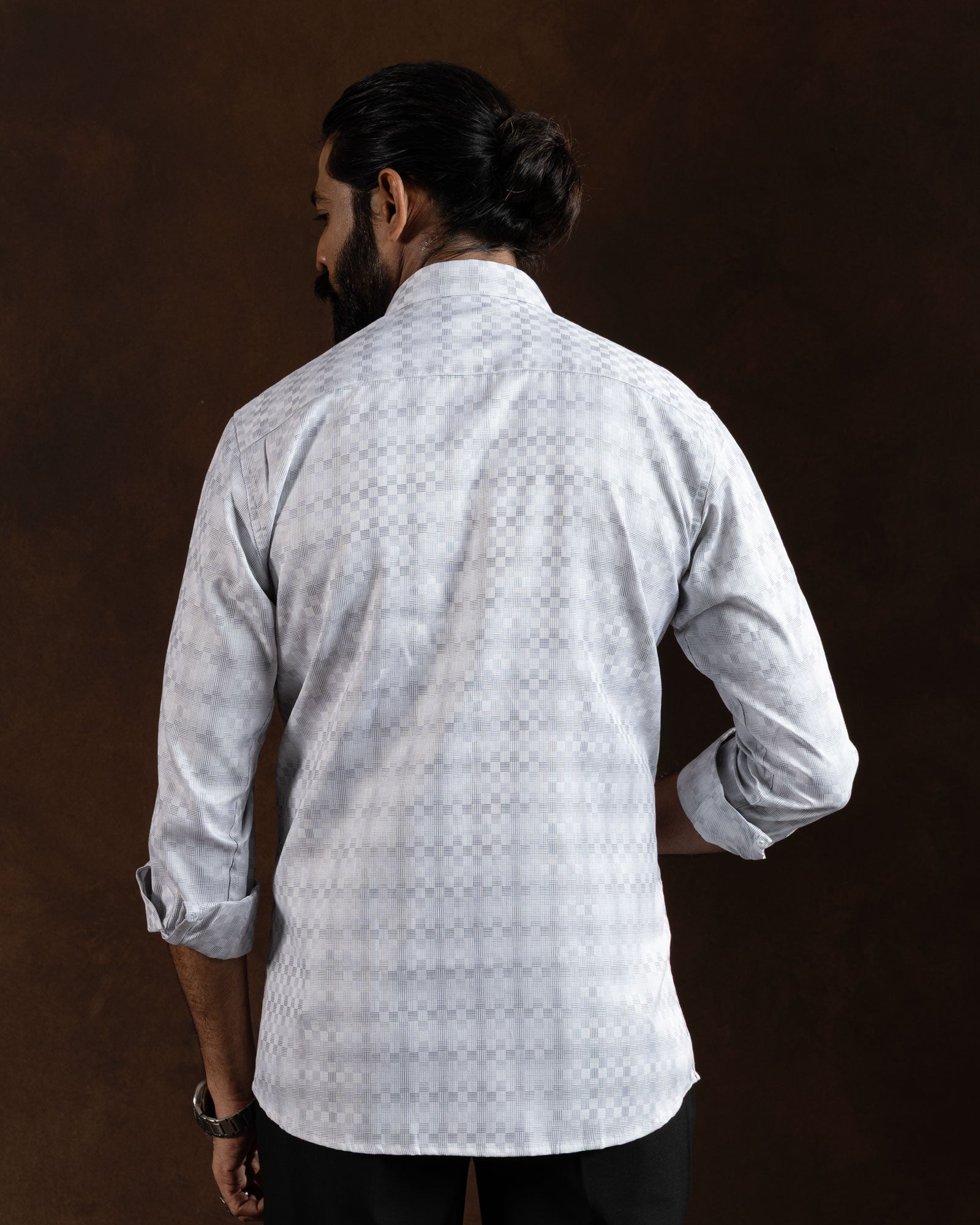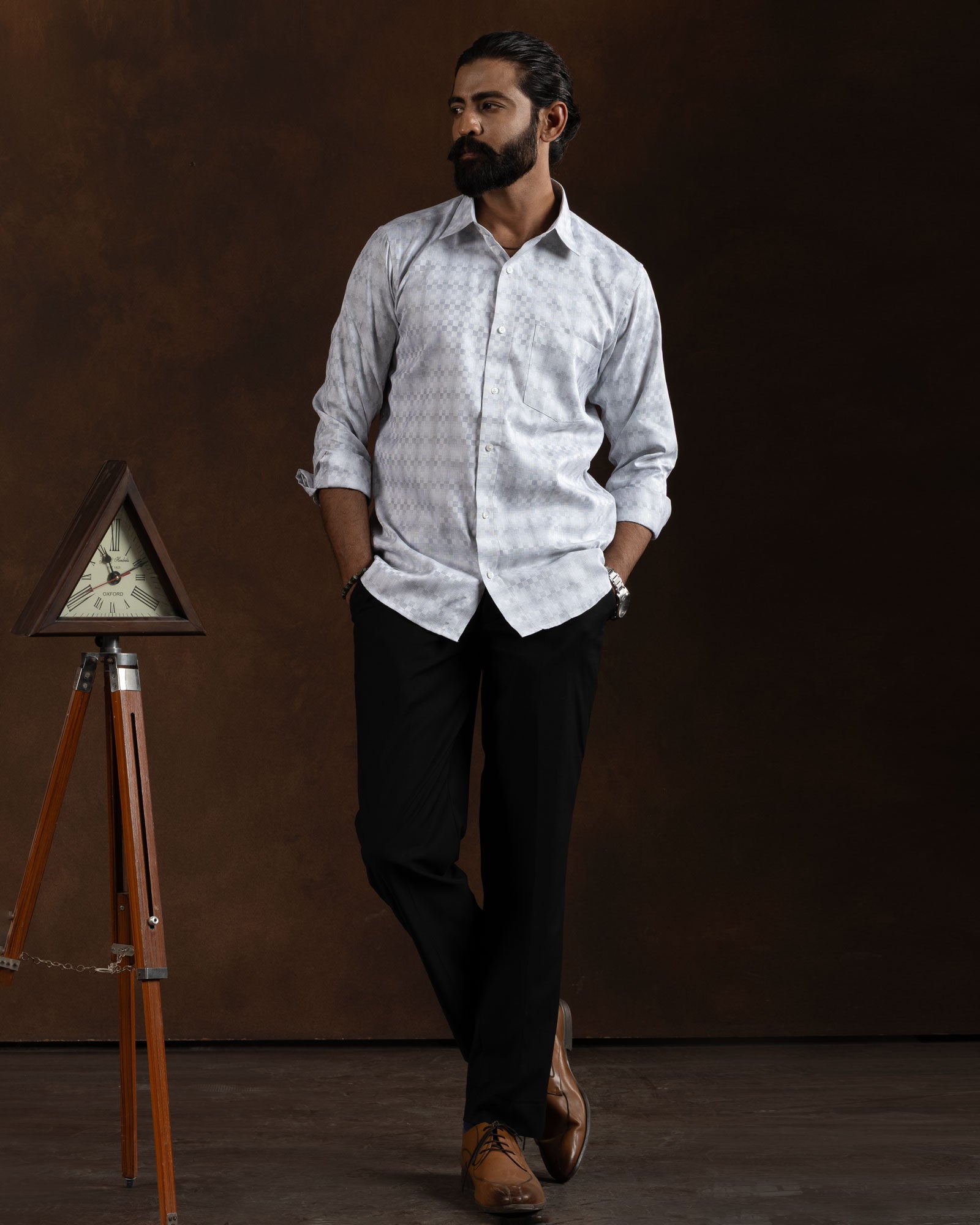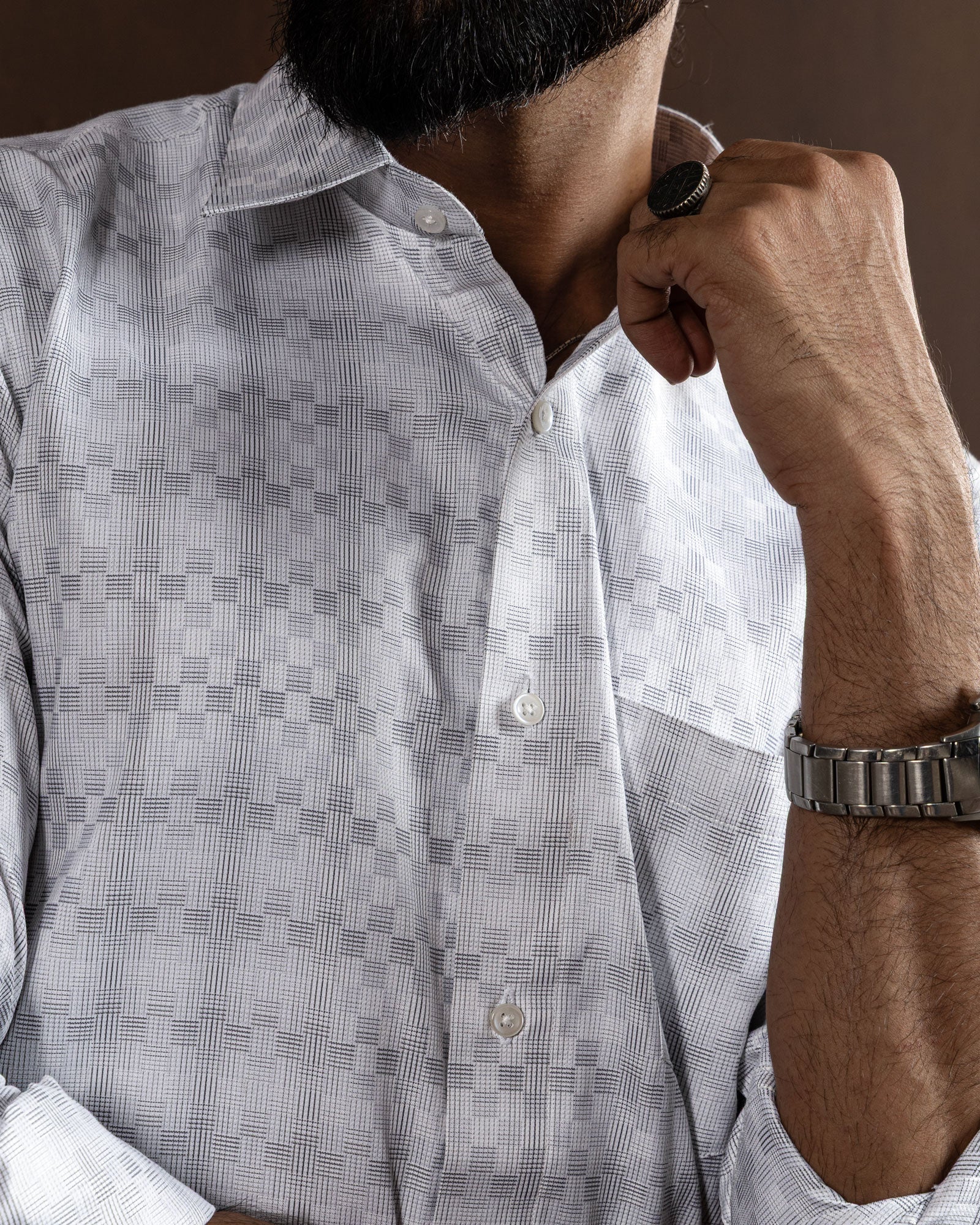 Elevate your wardrobe with this geometric cotton shirt, tailored for comfort and style. Featuring a structured collar, front pocket, and subtle pattern, it's perfect for smart-casual settings with a modern edge. The breathable fabric ensures all-day ease without compromising on elegance.
