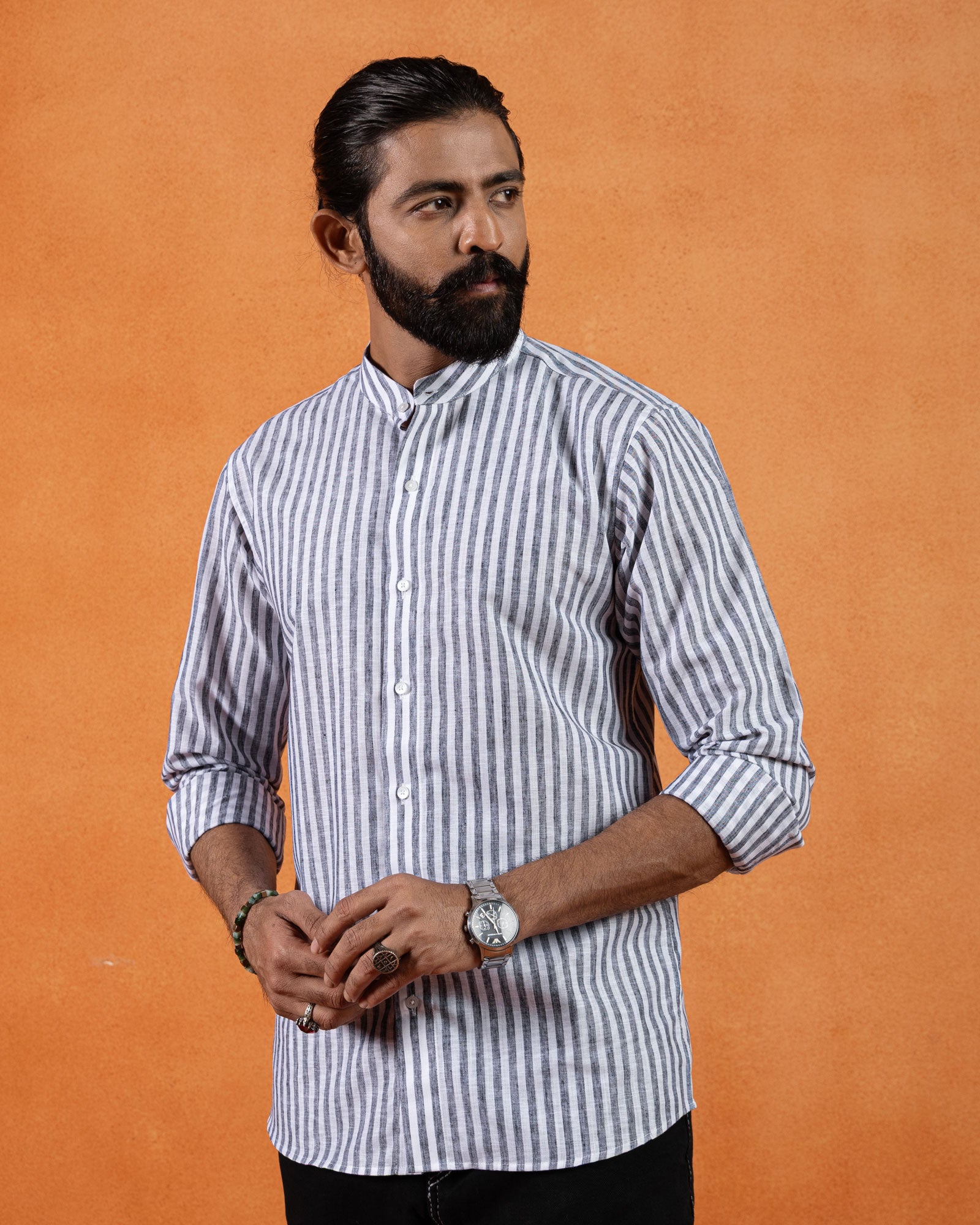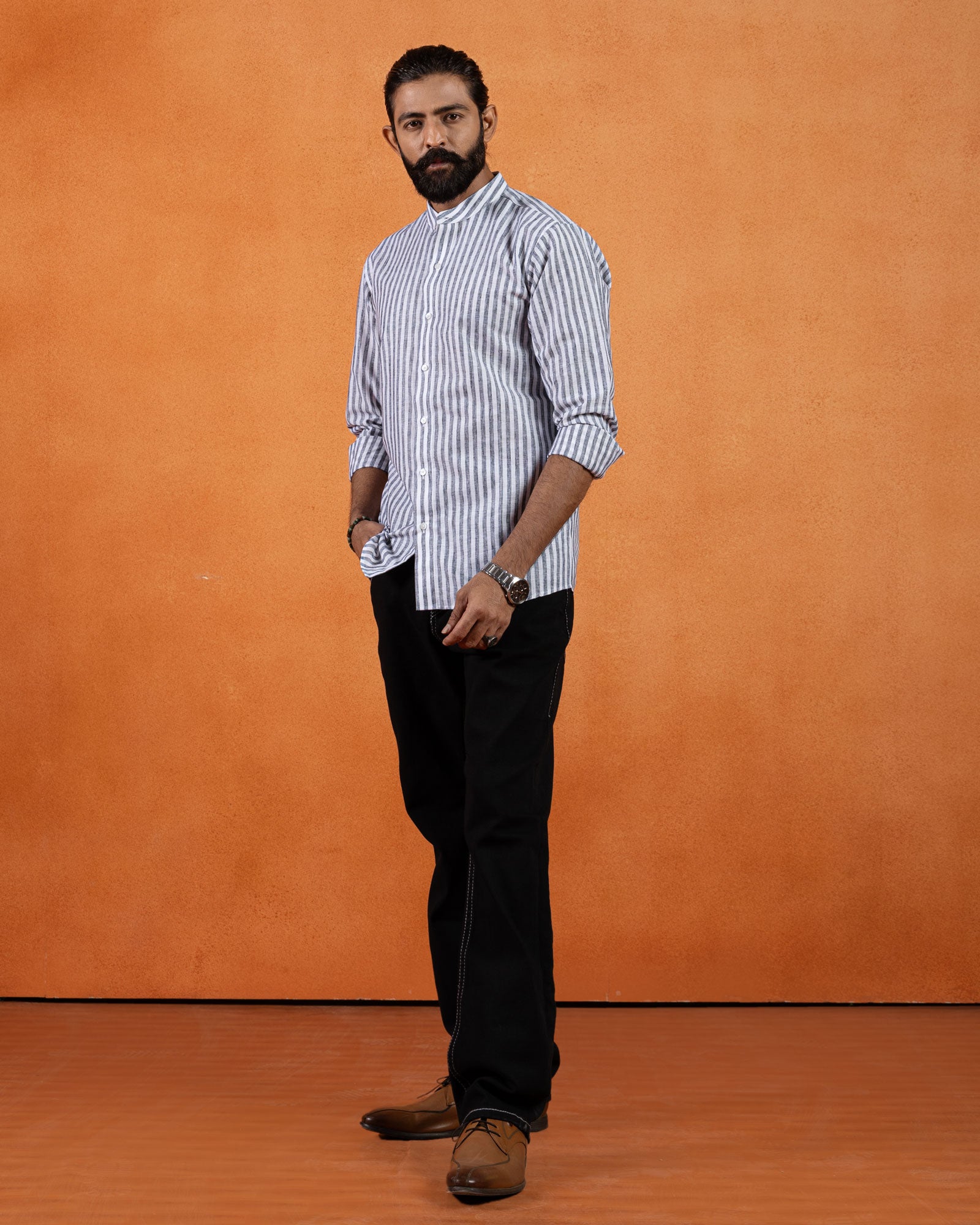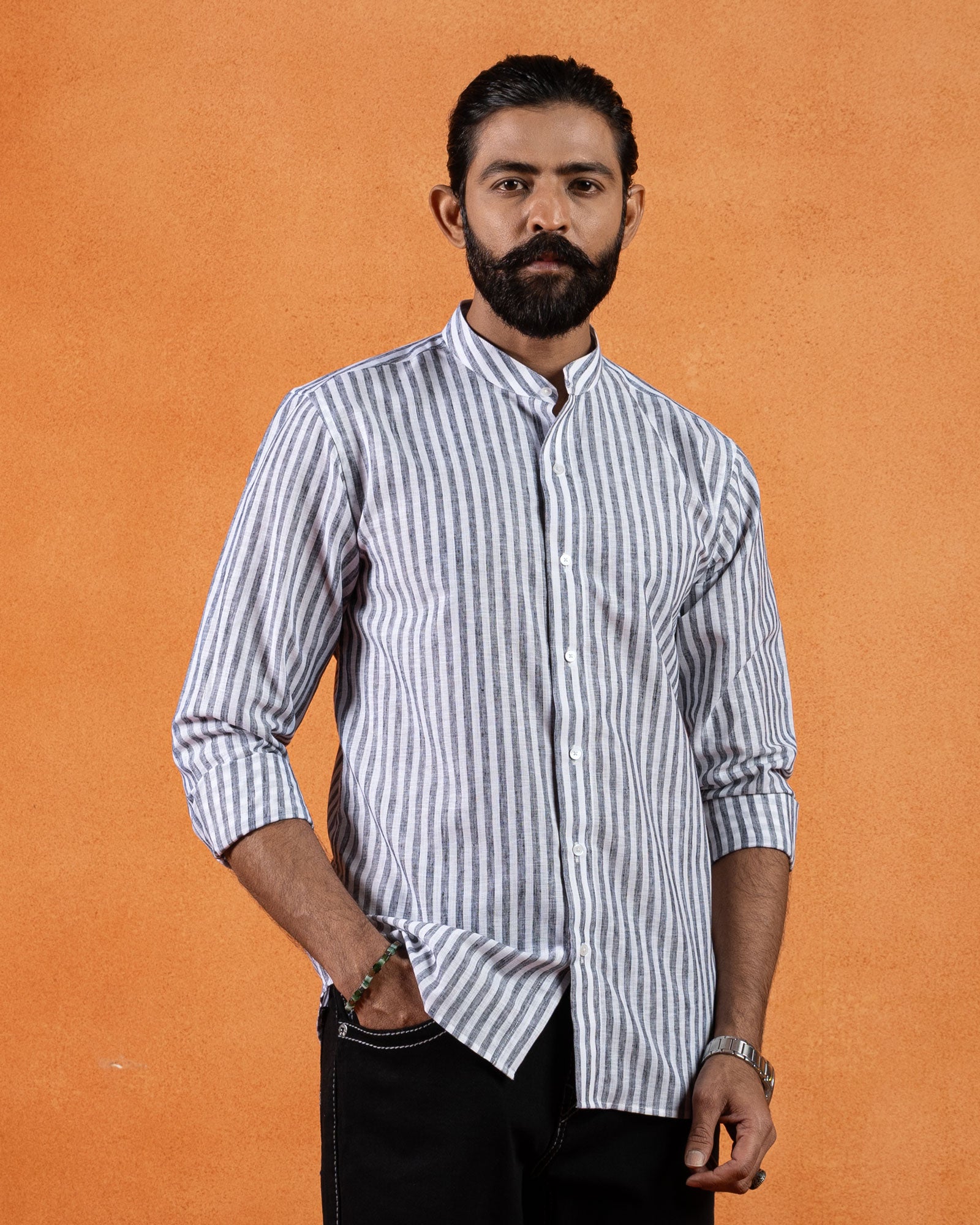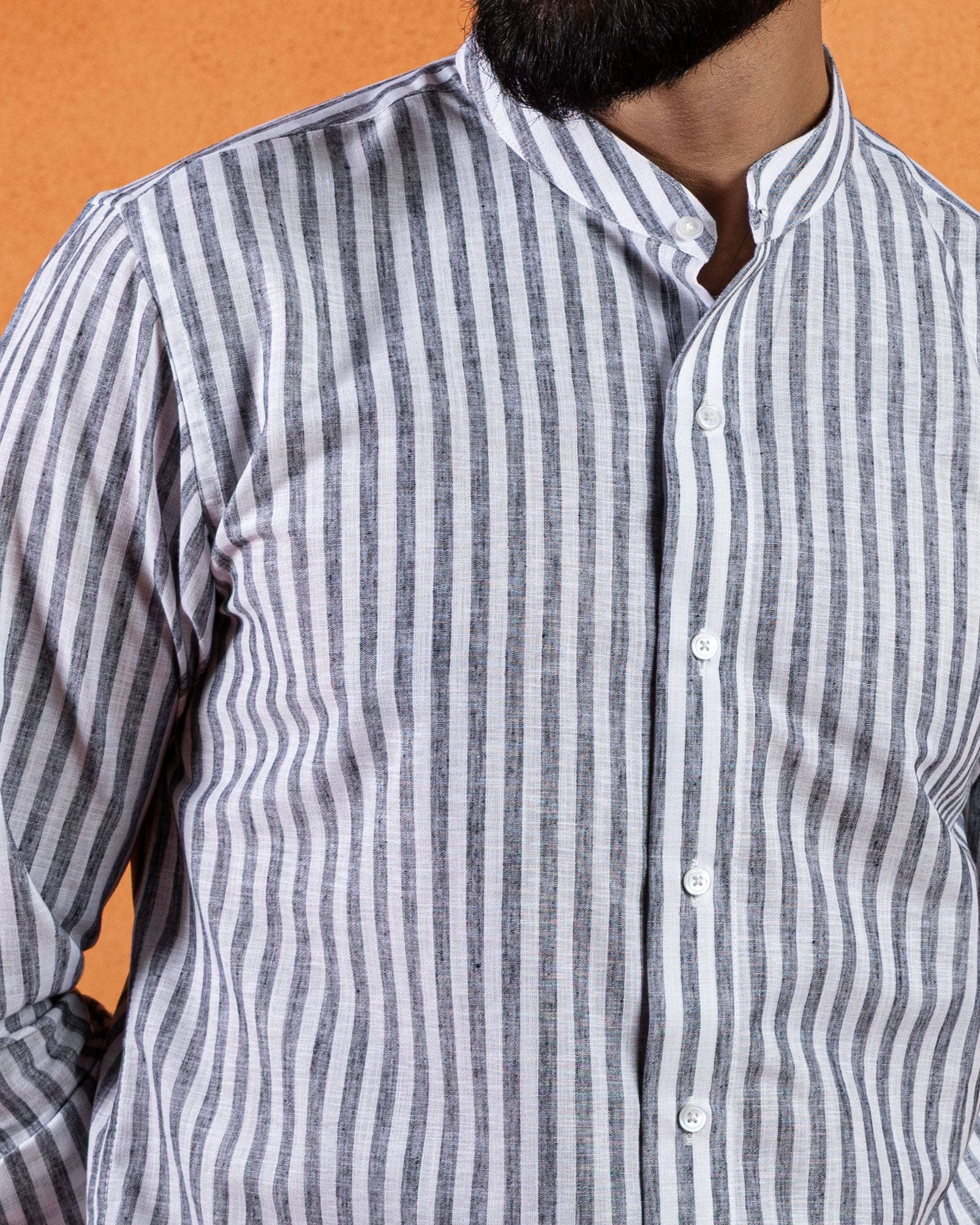 Refined with a modern edge, this striped linen shirt features a clean mandarin collar and a balanced slim fit. Crafted from breathable linen with a naturally textured finish, the fabric keeps the look light and composed, making it ideal for warm days and elevated casual dressing.