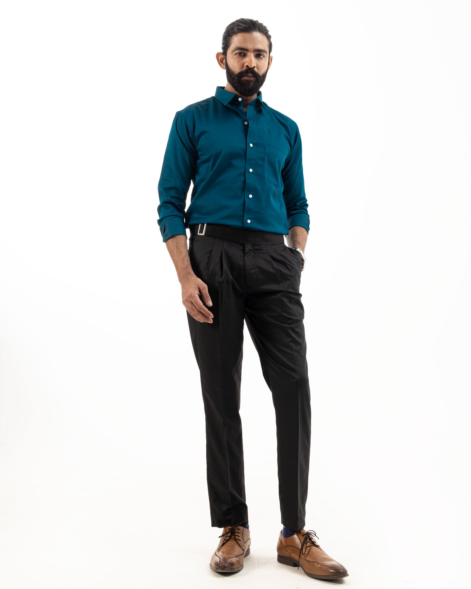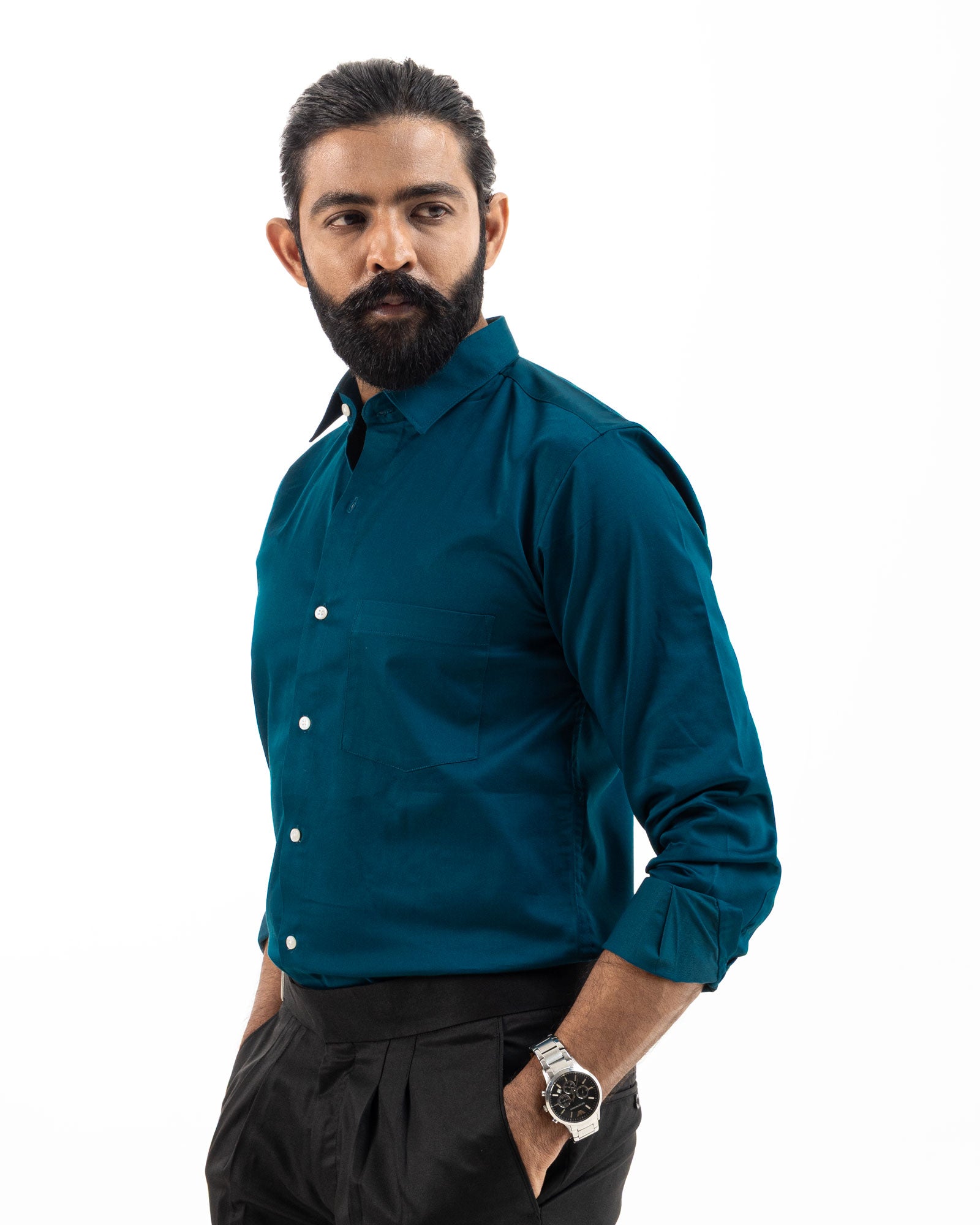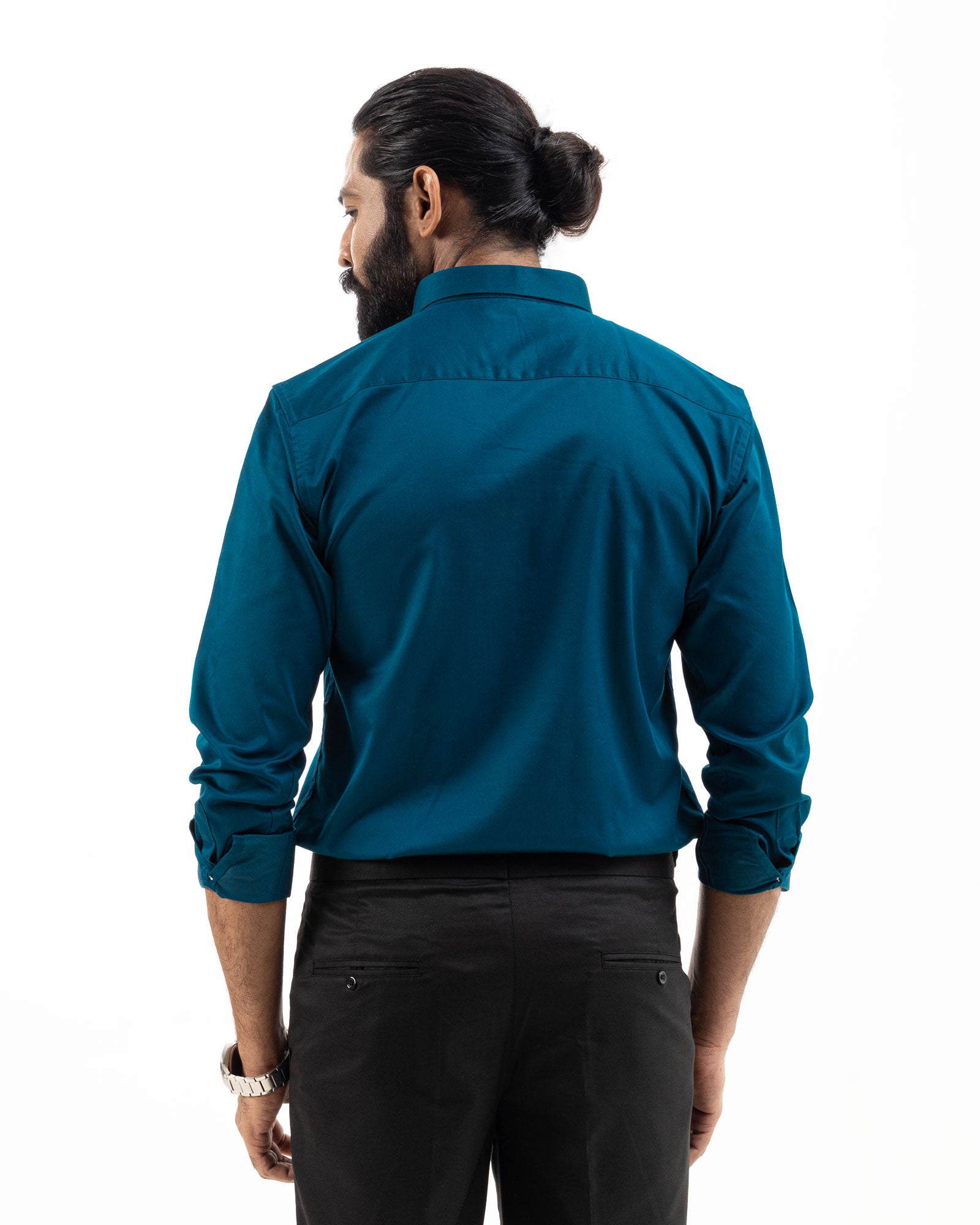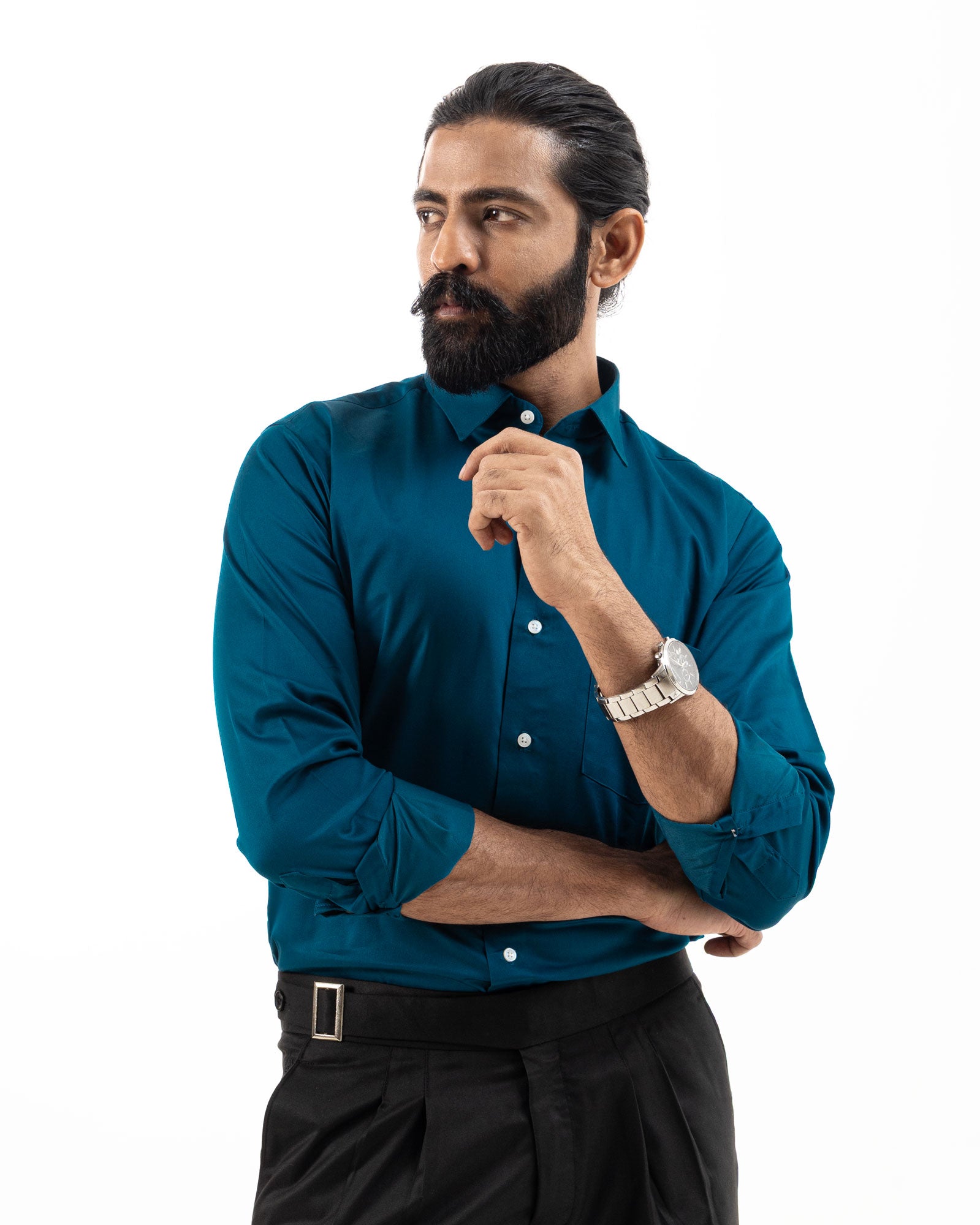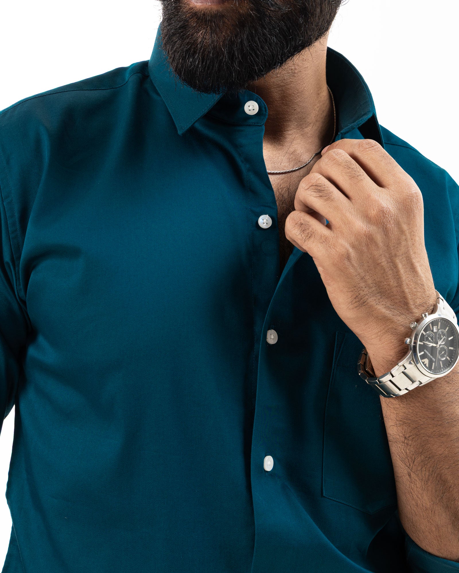 This classic teal shirt is tailored from premium cotton fabric, offering a crisp, smooth finish with a polished look. Featuring a sharp collar, clean front pocket, and a structured fit, it's ideal for formal settings or refined everyday wear.